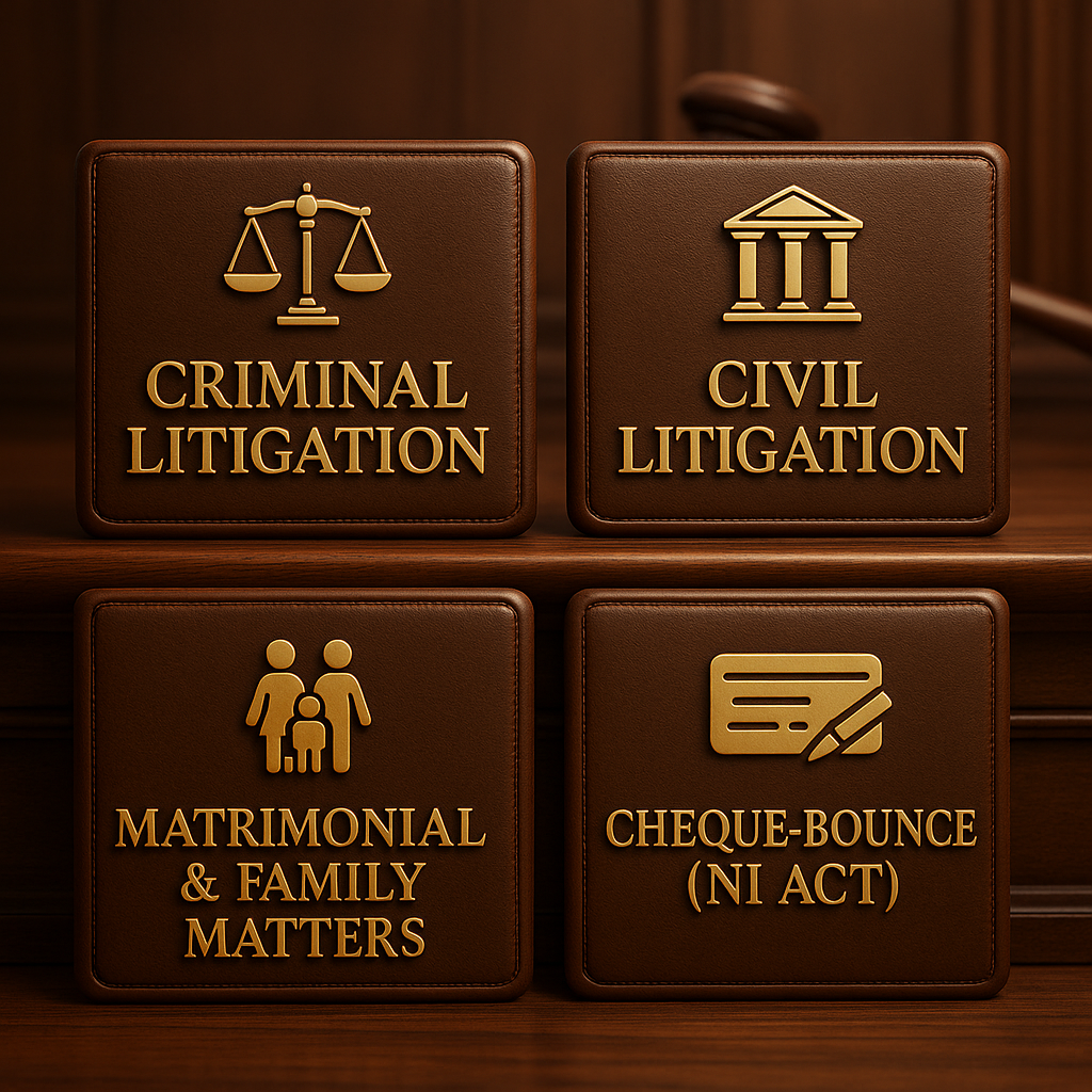 Our practice focuses on Criminal Litigation, Civil matters, Matrimonial & Family Law, and Cheque-Bounce (NI Act) cases, representing clients at trial and appellate courts across Delhi-NCR.